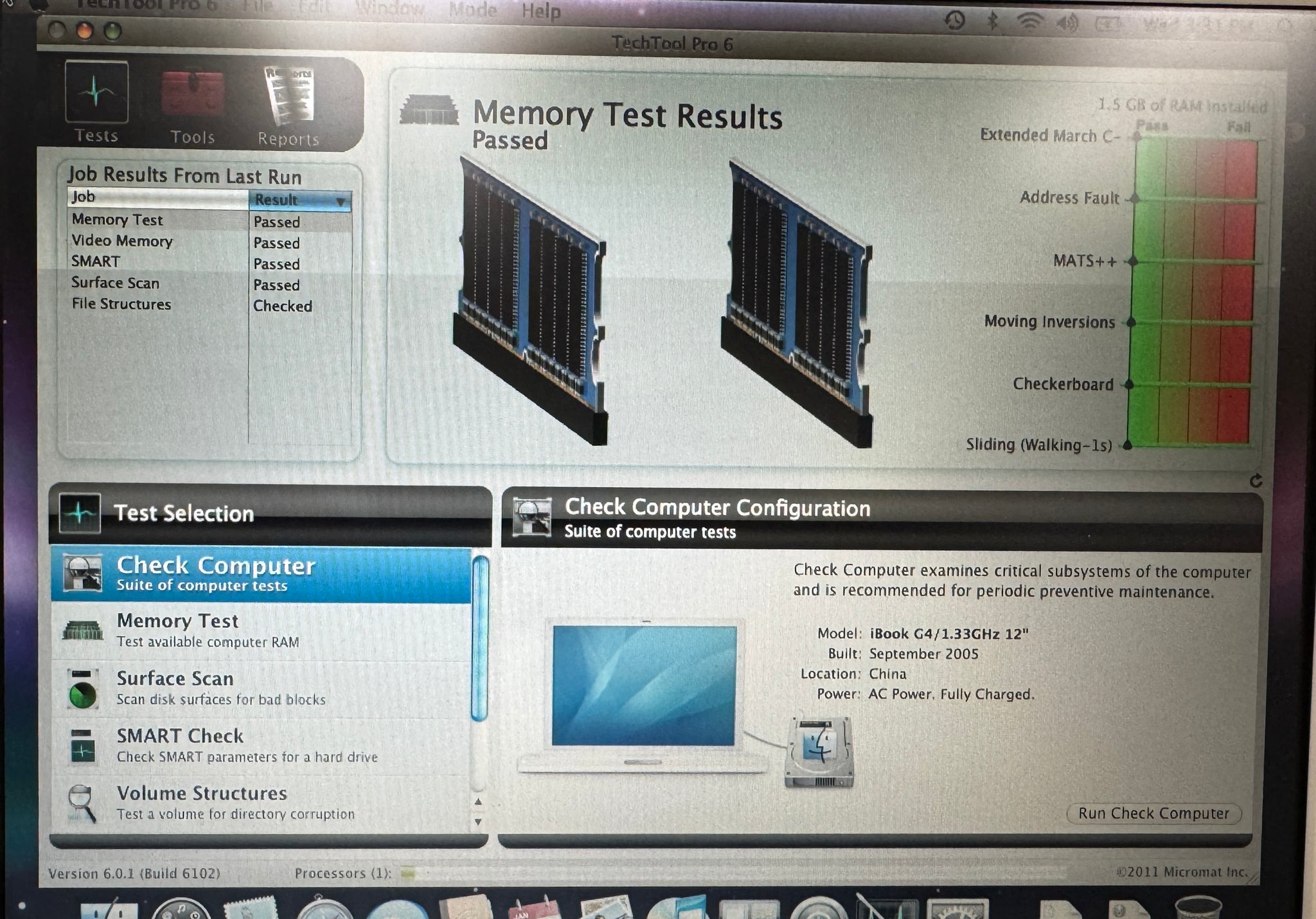 For sale is an Apple iBook G4 12-inch September 2005 1.33GHz (M9846LL/A), 1.5GB RAM, 80GB HDD, COMBO Drive, AirPort/ Bluetooth, ATI Mobility Radeon 9550 (32MB) On-board Graphics Card with a fresh install of macOSX Leopard 10.5.8 and 65W AC Adapter. The Battery is listed as Good with 0 Charge Cycles and holds a small charge, but we do not guarantee battery life on older laptops. WORKS PERFECTLY. Cosmetically 90/100. HARD TO FIND! SOLD AS-IS.
