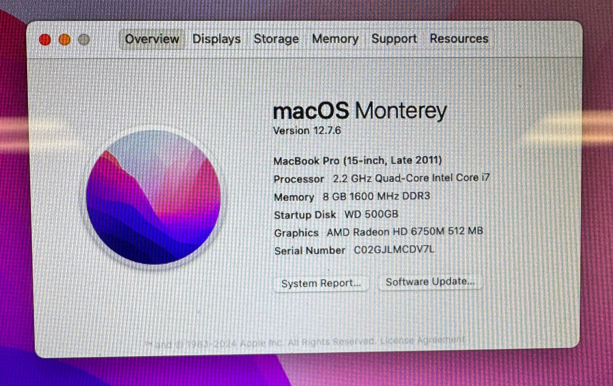 For sale is an Apple MacBook Pro 15-inch October 2011 2.2GHz Quad-Core Intel Core i7 (MD318LL/A), 8GB RAM, 500GB HDD, SuperDrive, AirPort/Bluetooth, AMD Radeon HD 6750M 512MB On-Board Graphics Card with a fresh install of macOS Monterey 12.7.6 through Open Core Legacy Patcher Version 2.4.1 and 85W MagSafe Adapter. The Battery has 13 Charge Cycles and holds a charge. WORKS PERFECTLY. Cosmetically 90/100. SOLD AS-IS.