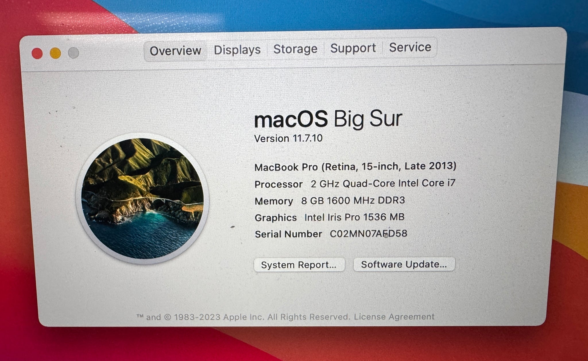For sale is an Apple MacBook Pro Retina 15-inch May 2014 2.0GHz Quad-Core Intel Core i7 (ME293LL/A), 8GB RAM, 512GB SSD, AirPort/Bluetooth, Intel Iris Pro 1536MB On-Board Graphics Card with a fresh install of macOS Big Sur 11.7.10 and 85W MagSafe Adapter. The Battery is NEW with 1 Charge Cycles and holds a charge. WORKS PERFECTLY. It passed Tech Tools Pro 20 with flying colors. There is a dark band on the left side of the display as shown in the picture. Cosmetically 90/100. SOLD AS-IS.