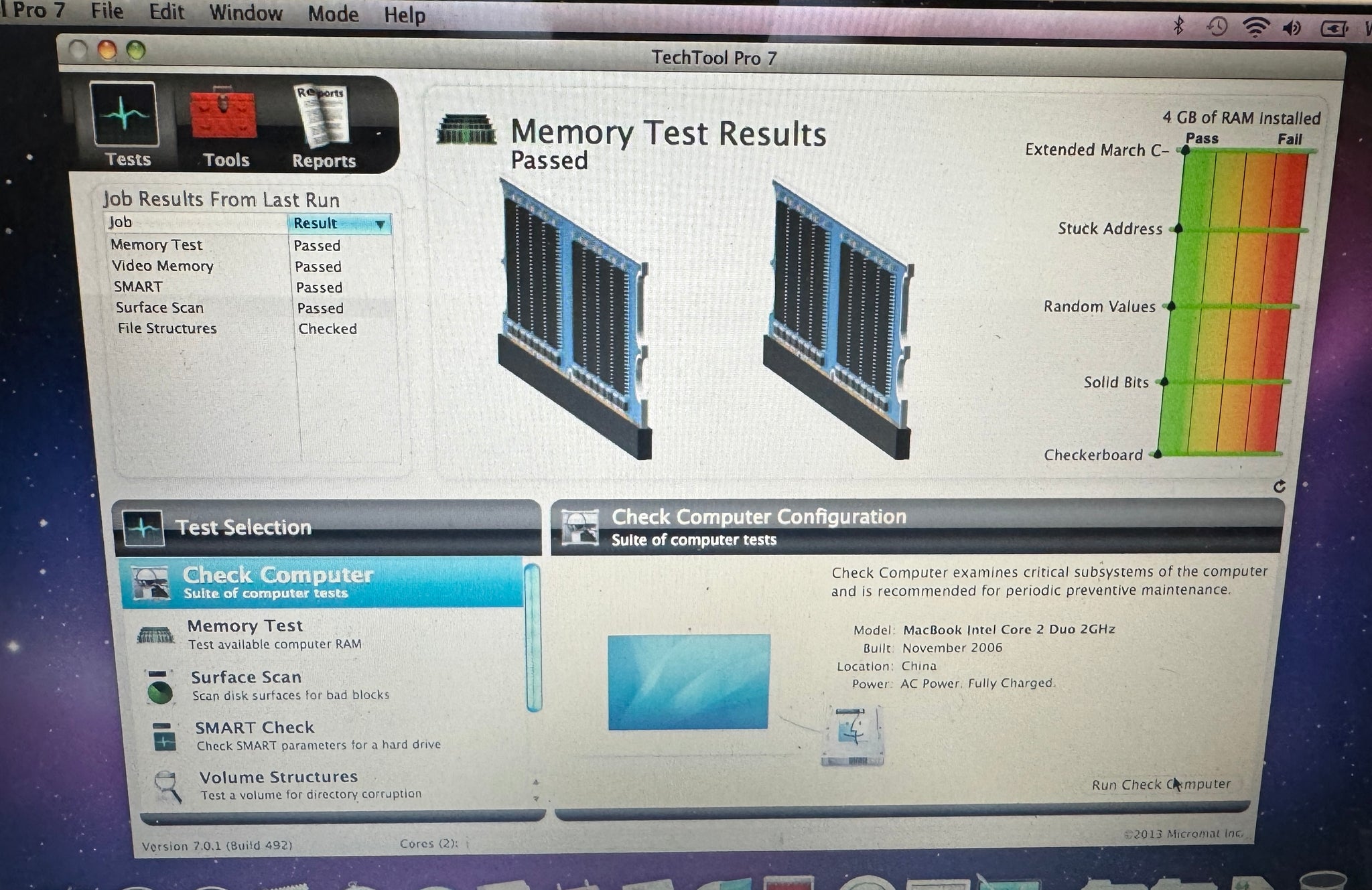 For sale is an Apple MacBook 13-inch November 2006 2GHz Intel Core 2 Duo (MA700LL/A), 4GB RAM, 160GB HDD, SuperDrive, AirPort/Bluetooth with a fresh install of macOSX Snow Leopard 10.6.8, Xcode, Rosetta, iLife '11, iWork '09 and 60W MagSafe Adapter. The Battery has 774 Charge Cycles and is listed as Normal. WORKS PERFECTLY. It passed Tech Tools Pro 7 with flying colors (see picture). SOLD AS-IS.
